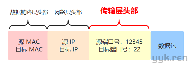 然后你在要发送的数据包上,增加了传输层的头部,源端口号与目标端口号。